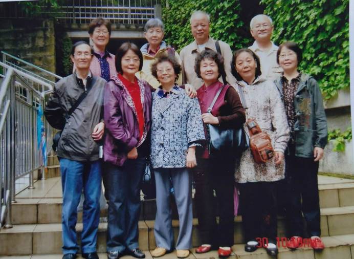 62级同学与沈豪老师于北碚三花石川外校门前留影