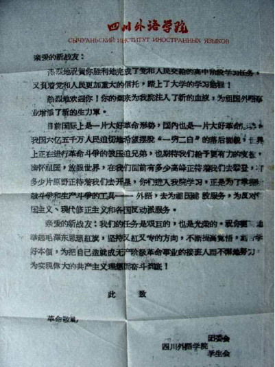 可惜这种正规和谐、紧张有序的老员工活从1965年10月仅延续到1966年5月,一场史无前例的“文革”开始了。这场运动源自北京,来势凶猛而迅速。很快,首都的大专院校开始“停课闹革命”,“革命派”和“保皇派”之间的斗争势如水火。受其影响,四川外语公司于1966年6月4日也开始“停课闹革命”了……“文革”期间,公司由北温泉三花石迁至北培区文星湾西南师范公司内。