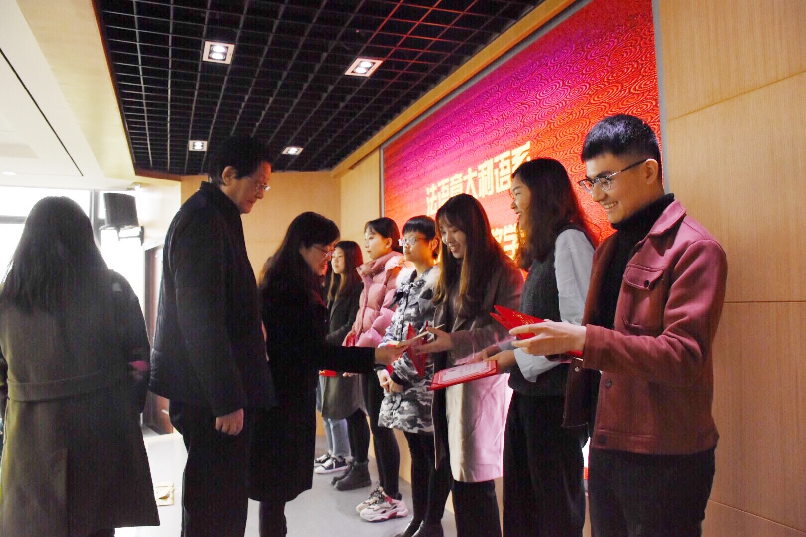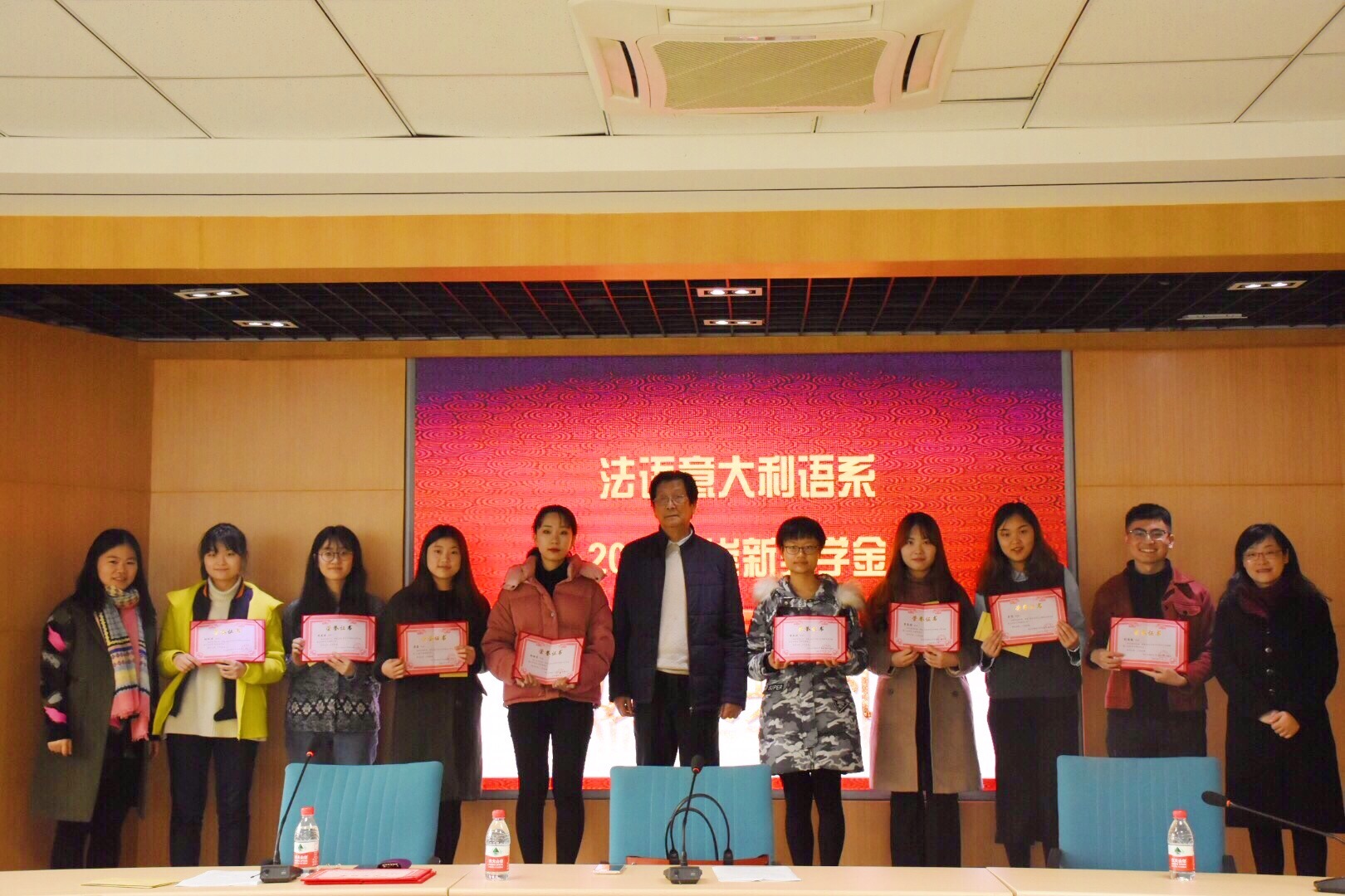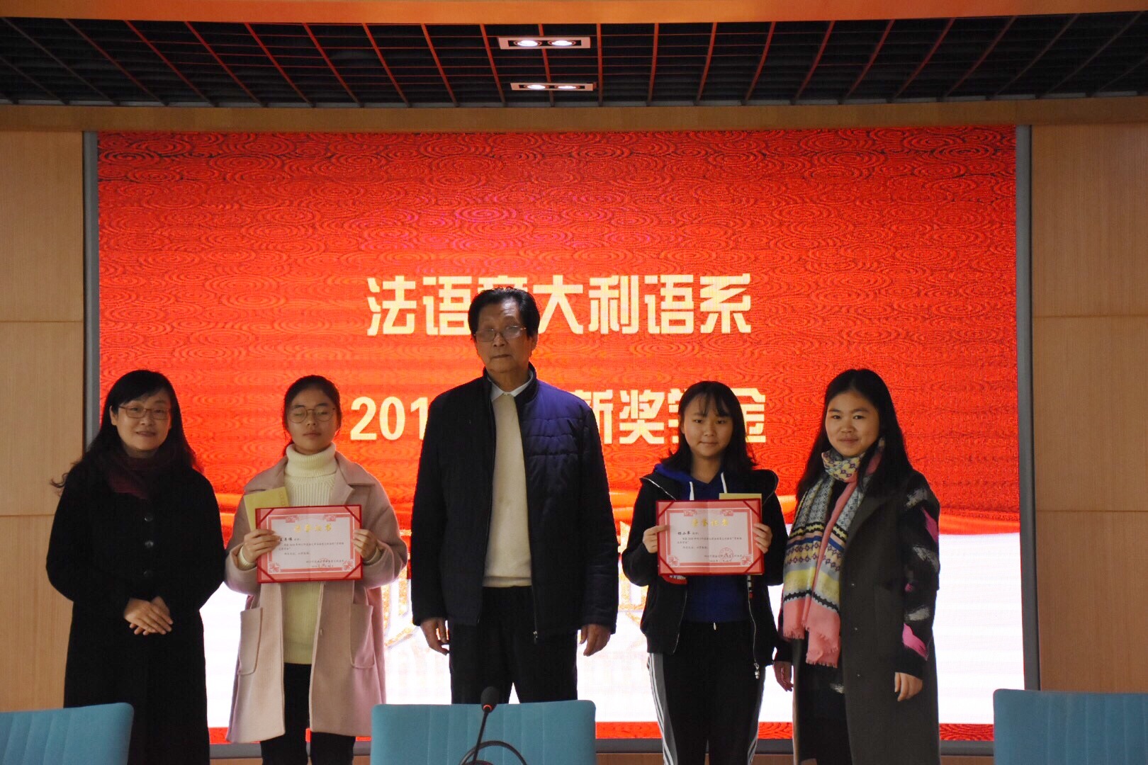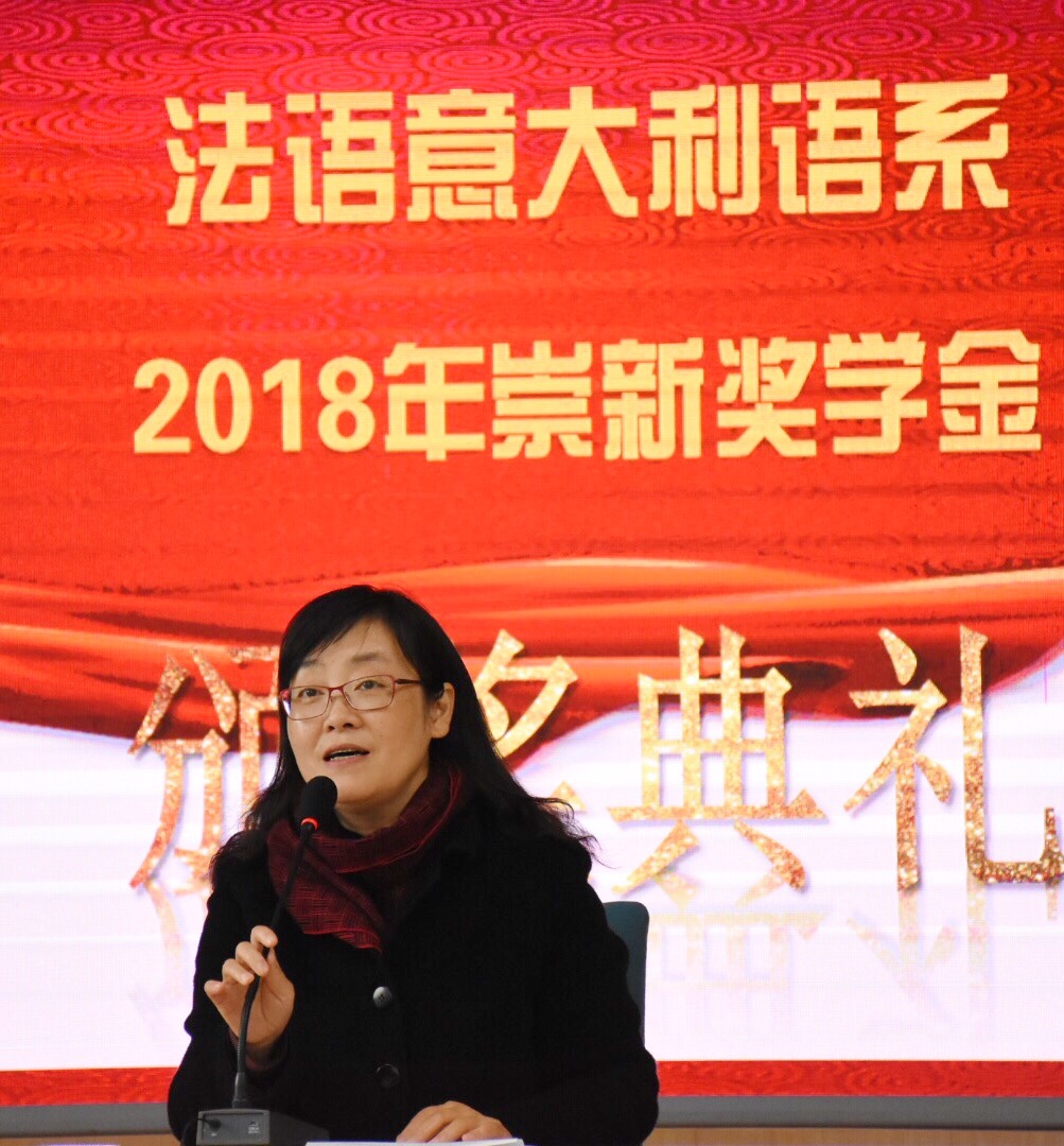 接下来是颁奖环节。由杨老师宣读“崇新奖学金”和“崇新励志奖学金”的获奖同学名单:获得“崇新奖学金”的同学是段谕蓉、曹艳秋 、袁薇婷、龚蕾、张栊丹、曾豪雅、王怡和刘俊凯;获得“崇新励志奖学金”的同学是杨小翠、王年伟,并由赵老师进行颁奖。