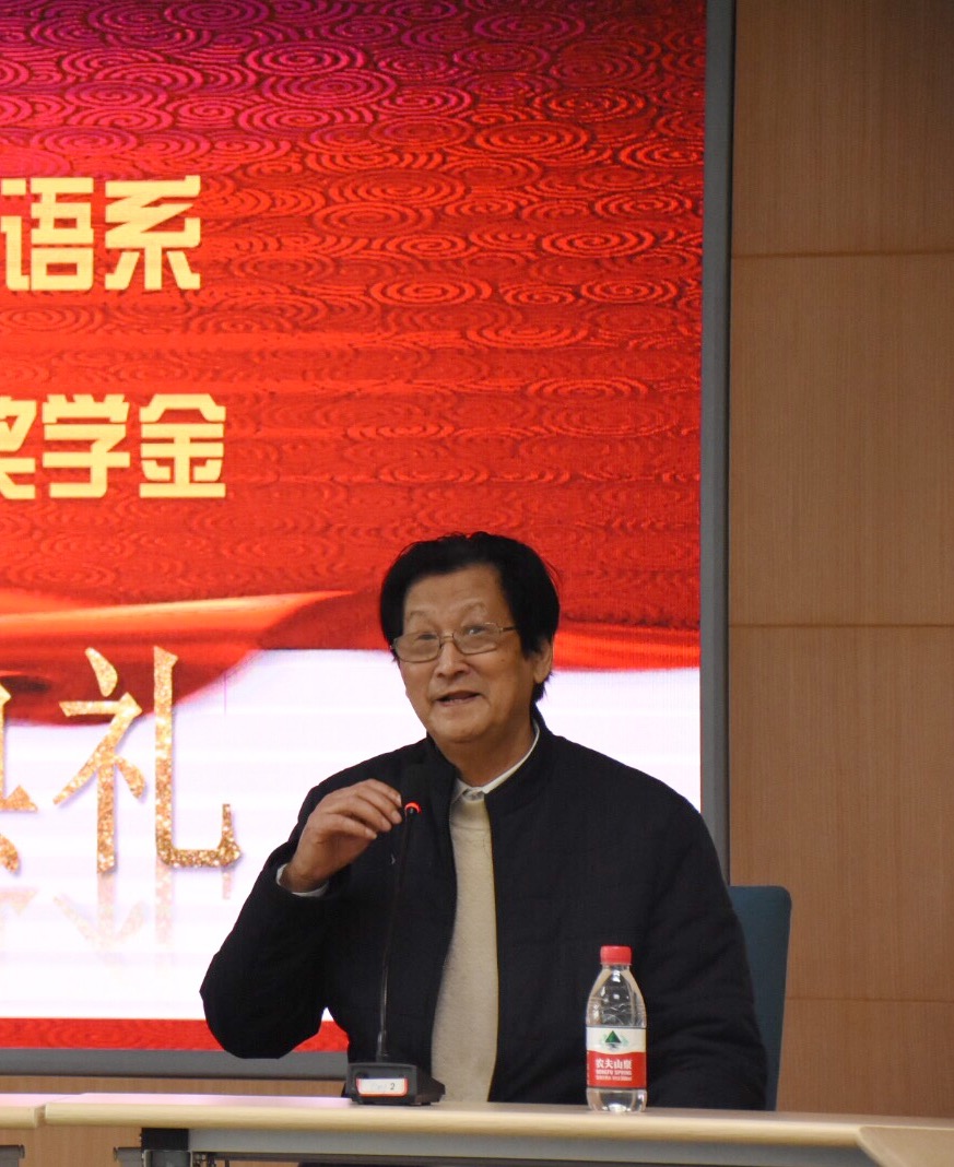 首先,杨老师介绍了赵老师的杰出成就和对我国与刚果(布)友好往来的卓越贡献和崇新奖学金的由来。赵老师是太阳成集团tyc234cc法语专业首届(60级)毕业生,多年来为中国和刚果(布)两国的经贸合作做出了巨大努力,被称为中刚两国“民间大使”。因其巨大贡献,刚果(布)政府分别于2003年和2011年授予其总统荣誉勋章、国家荣誉勋位“高级骑士勋位”。赵老师虽已毕业数十载,但仍心系母校,对法意语系的学子们十分关心。他于2006年出资设立“崇新奖学金”,用于奖励我系法语专业品学兼优的员工,为我系发展助力。此外,由赵老师捐资100万元新建的大校门也于今年落成。