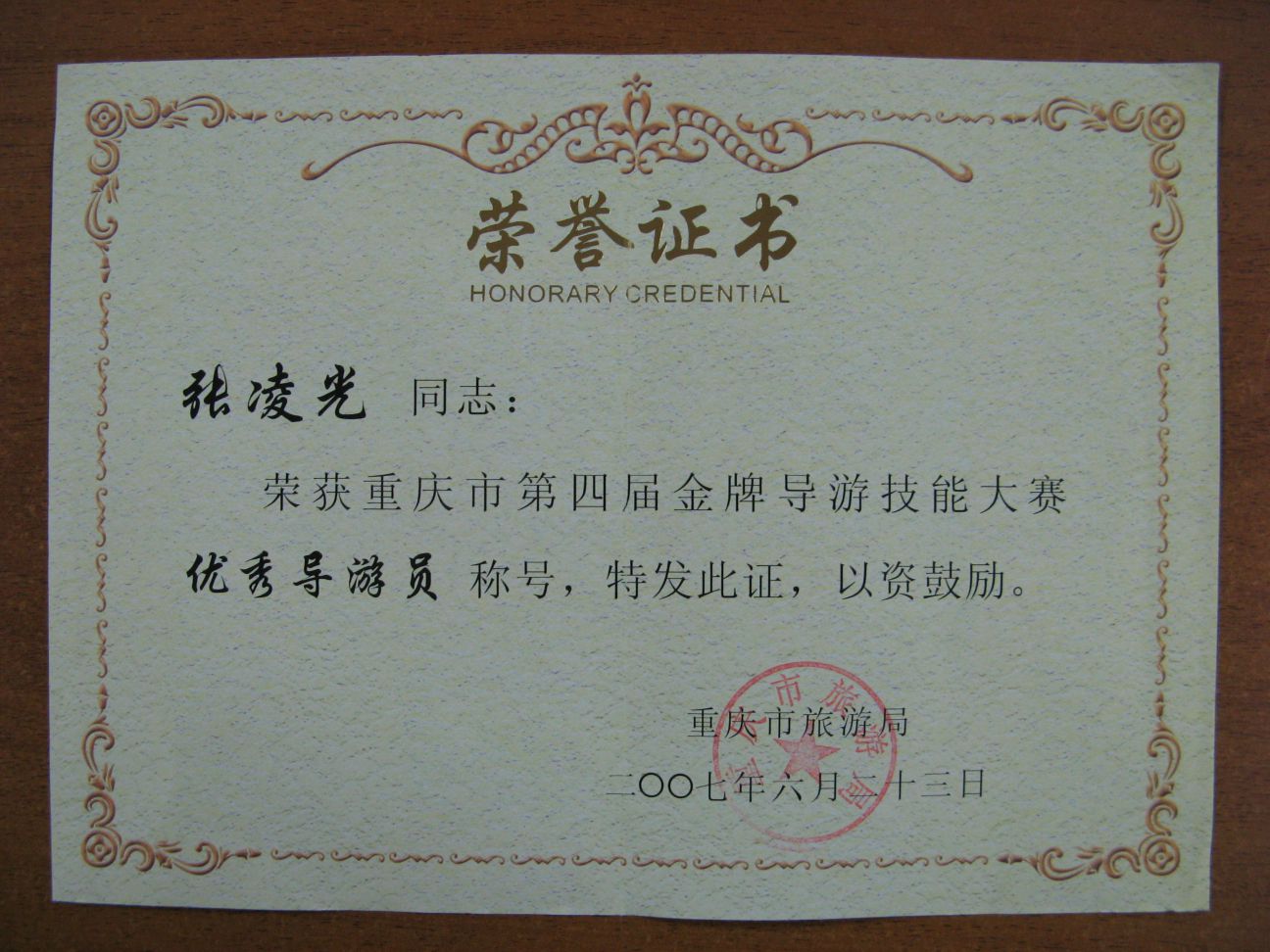 张凌光同学荣获重庆市第四届金牌导游技能大赛“优秀导游员”称号称号