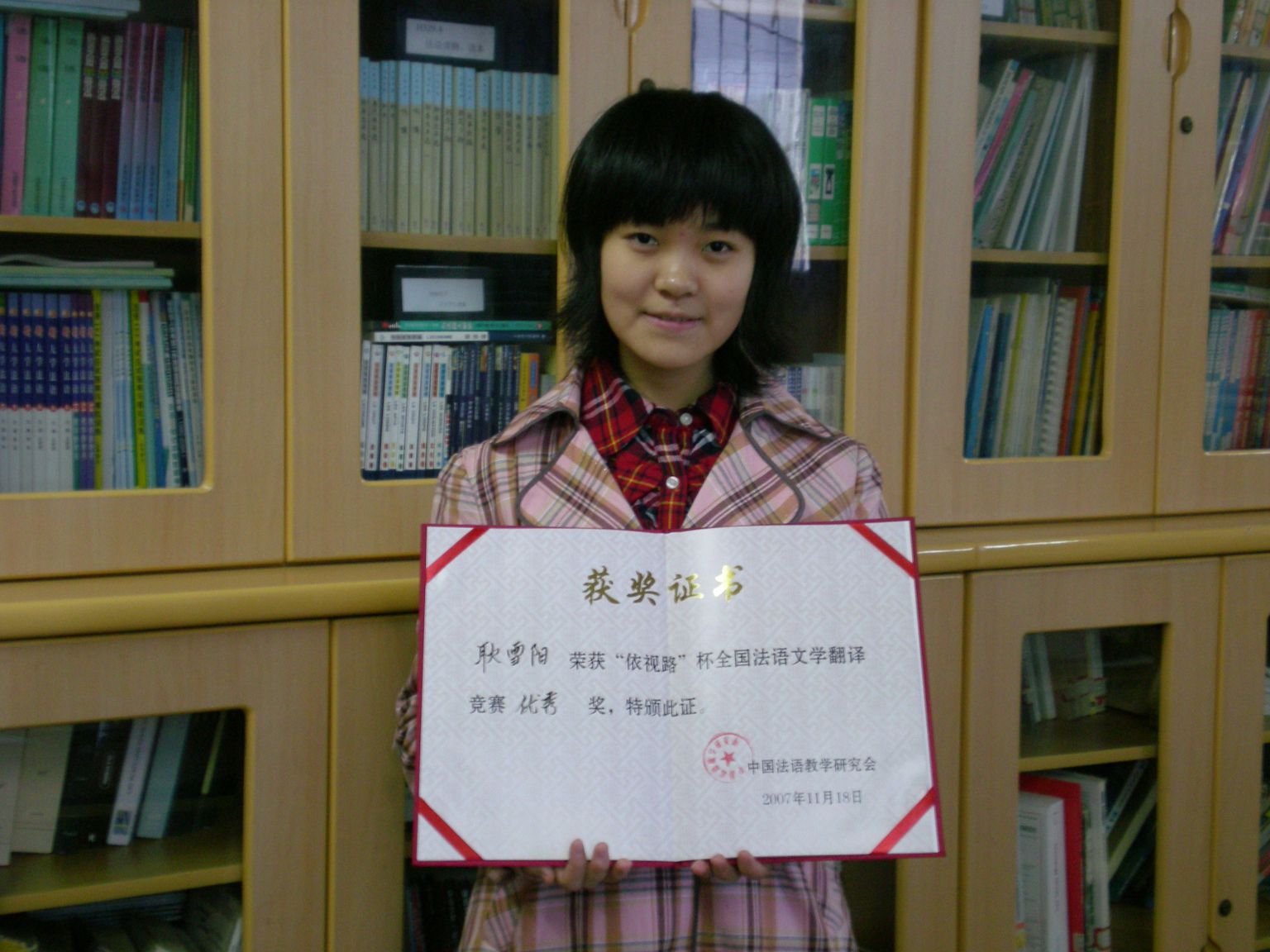 耿雪阳同学获得“依视路”杯全国法语文学翻译竞赛优秀奖