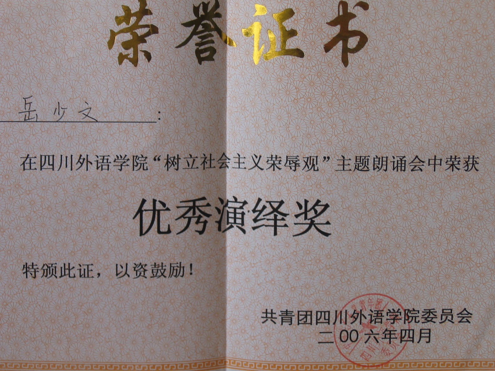 陈琰同学在2004年西南地区枫叶杯法语演讲比赛中获得第二名