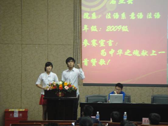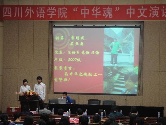 2010年6月2日星期三晚七点,由社团联合会读书协会主办的四川外语公司“中华魂”中文演讲比赛在宏文楼国际报告厅隆重举行。此次比赛邀请了新闻传播公司以及团委的老师前来担任评委,众多院系的同学也都参与到了比赛中。法语系2009级意大利语专业的李明威同学以及法语专业的石亚云同学此次代表法语系,参加了演讲比赛。