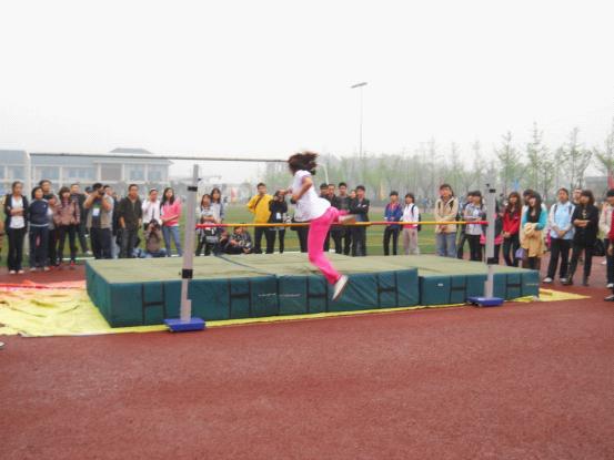 2011年4月15日运动会在小雨中继续,这丝毫没有浇熄运动员们火热的激情。下午2时,在女子跳高比赛中我系10级意大利语专业员工夏大鹏以轻盈的跳跃和沉稳的落地赢得了观众的阵阵掌声,最终获得了第四名的好成绩!为法语系赢得了荣誉!