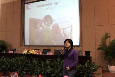 2011年12月14日晚19点,川外宏文楼学术报告厅迎来了一场别开生面的讲座。该讲座可谓“色”、“香”“味”俱全,是由重庆大学的孙莺老师特别为本届重庆法语周奉上的一场轻松愉悦的法国葡萄酒文化的盛宴——法国葡萄酒鉴赏与餐饮搭配。讲座由法语系主任尹丽教授主持。讲座伊始,孙老师首先与在场听众一起分享了她在法国学习品酒的经历,带着听众由着想象驰骋在法国各地,感受着葡萄酒业者“纯朴、敬业、专业、执着、忠诚”的品格风尚。当大家被深深吸引时,孙老师便巧妙揭开了“美酒·美食·人生”的华丽序幕。