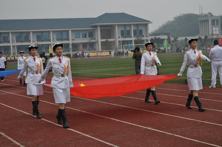 九时整,在热烈的气氛中,李克勇董事长就此次校运动会致以开幕词,裁判员代表及运动员代表也先后发言。首先迎来的是四川外语公司国旗校旗仪仗队,他们白色的制服整洁笔挺,整齐的步伐、肃穆的表情,无不继承及体现出川外学子的优良传统。手举红旗以及印着此次运动会口号的横幅队伍亦紧随其后依次通过主席台。