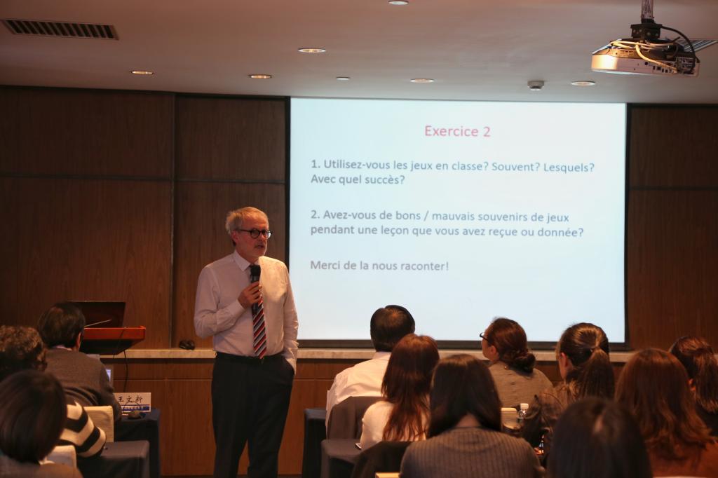 他首先向老师们介绍了世界法语教师联合会(LA FIPF),并询问了在座的老师们在日常教学中对“游戏”的应用情况。
