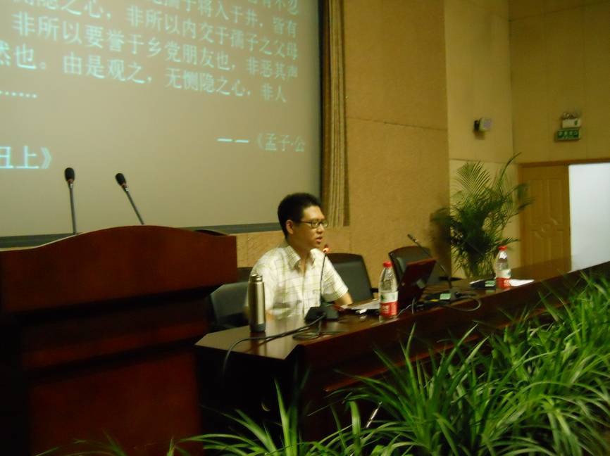 2011年6月16日晚7:00,由法语系举办的国学系列讲座之“中国思想史概览”在宏文楼国际报告厅展开。法语系邀请到了中文系王晓萌老师向全校师生们讲授国学知识。法语系系主任尹丽、党总支书记杨少琳及众多老师均出席参加。