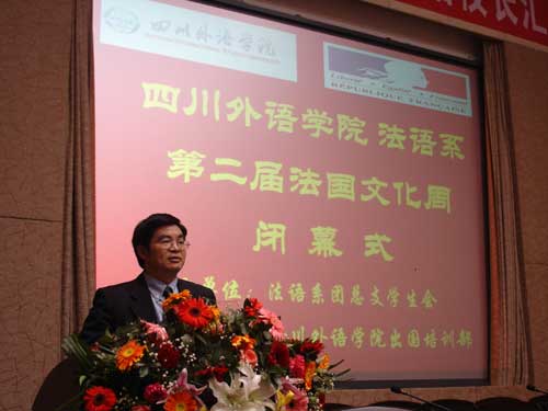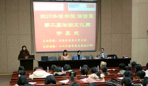 四川外语公司法国文化周是由四川外语公司法语系团总支员工会组织的一年一度的大型活动。本次法国文化周历时9天,围绕法国高等教育这一主题,开展了内容丰富、形式多样的系列活动,包括留学法国专题讲座、法国高等教育主题展览、文艺晚会、法国经典音乐剧欣赏和法国文化讲座等。深入浅出的留学讲座介绍了中法高等教育体制的异同和留学法国的独特之处;内容丰富的法国高等教育主题展览多角度多方位的介绍了法国高等教育体制;精彩纷呈的文艺晚会更是把此次文化周推向了高潮,12日晚上的大礼堂是法语系和全校师生共同欢乐的殿堂,整场晚会都保持了极高的上座率;生动感人的音乐剧《巴黎圣母院》通过浪漫主义艺术手法和主人翁可歌可泣的故事,让同学们接受了一场美与丑,善与恶的洗礼;最后的法国文化主题讲座,采用师生互动轻松愉悦的方式传授文化知识,也给此次法国文化盛宴增色不少。