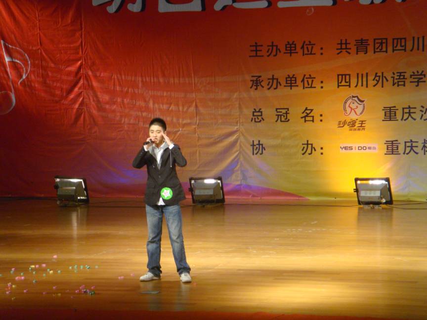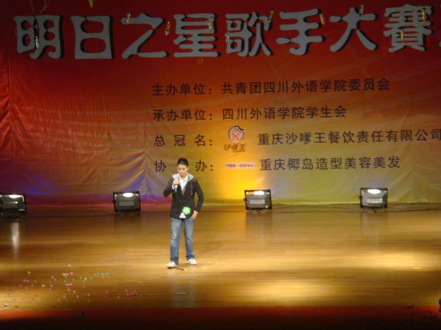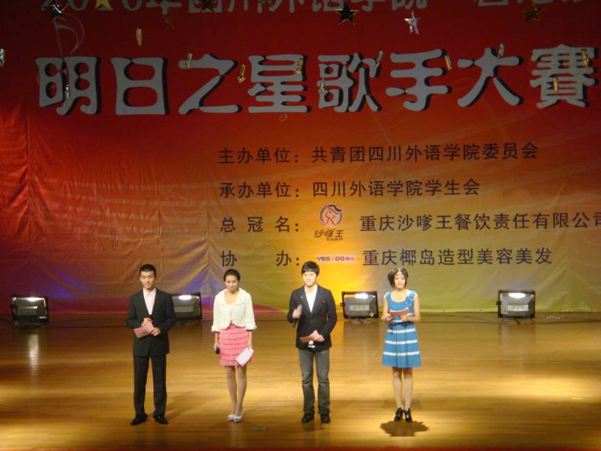 2010年11月17日晚19:30,由共青团四川外语公司委员会主办,重庆沙嗲王餐饮责任有限公司总冠名的“明日之星”校园歌手大赛于在大礼堂拉开了帷幕。此次活动旨在繁荣校园文化生活,提高老员工艺术素质,努力营造积极向上、健康文明的校园文化气氛,为员工提供展示自己才华的舞台。出席本次大赛的有校团委书记丁欢,沙嗲王餐饮责任有限公司代表曹先生、单小姐,校员工会主席陈楚杰,各系团总支副书记等。并由资深音乐人王海老师、校工会主席张勤老师、优秀校园歌手兼原艺术团合唱团团长张瑶、苏冬梅等担任本次大赛评委。评委主要根据选手的演唱技巧、舞台表现力、衣着打扮等打分,最终按分数的高低依次产生奖项。