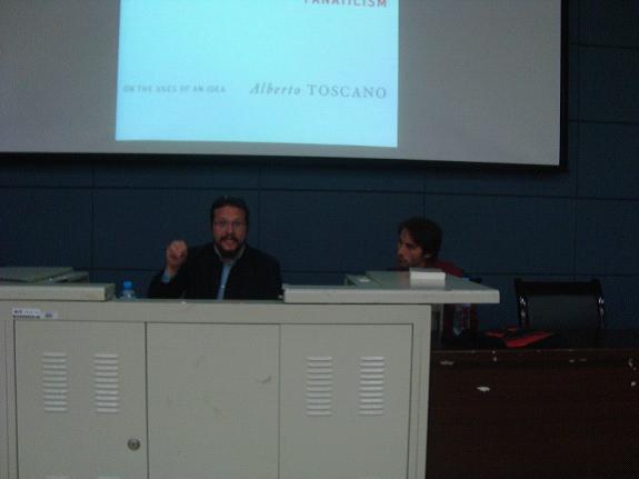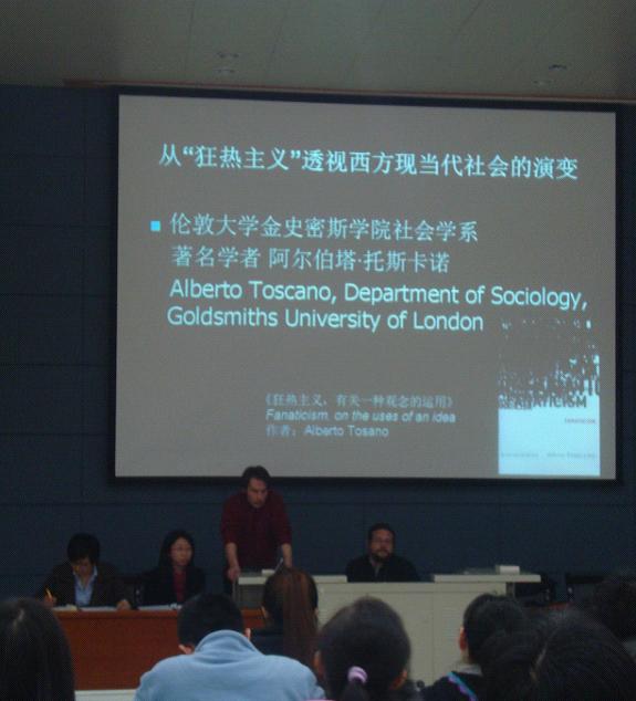 2011年4月11日下午四点二十分,在西区B栋三楼学术报告厅,来自伦敦大学金史密斯公司社会系的著名学者阿尔伯诺·托斯卡诺教授开设了题为“从狂热主义透视西方现当代社会的演变”的讲座。这次讲座也是配合意大利专家山谷老师的通识课程“文艺视角中的西方社会”进行的特别课程。山谷老师主持了本次讲座,出席本次活动的有法语系意大利语教研室主任杨琳副教授、部分意大利语专业教师。除了意大利语专业的同学和选修了通识课的同学之外,很多感兴趣的师生也前来听讲。