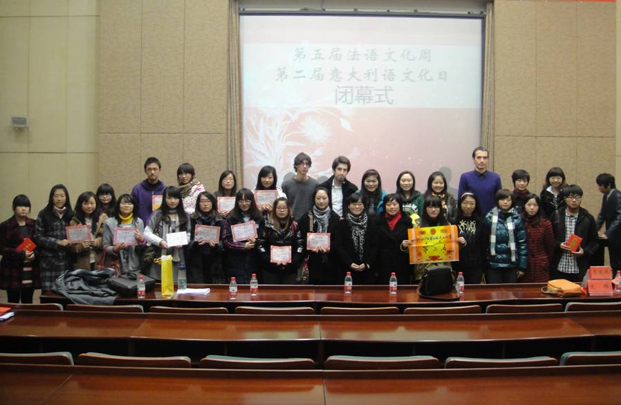 2010年12月23日下午,在宏文楼二楼国际报告厅举行了第五届法语文化周,第二届意大利语文化日闭幕式。出席本次闭幕式的有重庆市社科院研究中心刘波教授,法语系系主任尹丽教授,法语系党总支书记杨少琳老师,意大利语教研室主任杨琳老师,法语系和应用外语公司老师代表,及法语系全体同学。