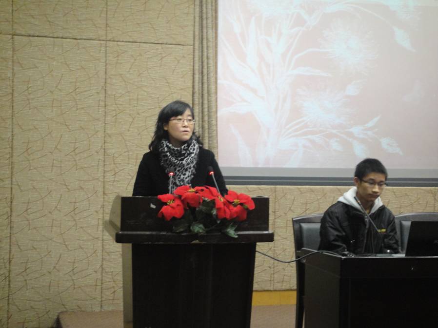 首先,杨少琳老师上台致辞,她高度肯定了法语系的所有同学在法语文化周中所做的一切工作并向全体师生致谢。之后进行的是表彰大会。会议表彰了2010法语系元旦晚会的精彩节目,法语和意大利语PPT大赛中的优秀作品,以及员工会先进个人、优秀团干部、优秀员工干部等等。接着,杨少琳老师向法语系的同学们公布了一系列的喜讯。如在公司男子排球赛中,法语系获得了第四名;在公司女子排球赛中,法语系获得了第三名;在武术长拳比赛中,法语系创造了第二名的佳绩。而最鼓舞人心的莫过于在社联魅力形象大使决赛中,法语系更是所向披靡,包揽了比赛的前三甲!